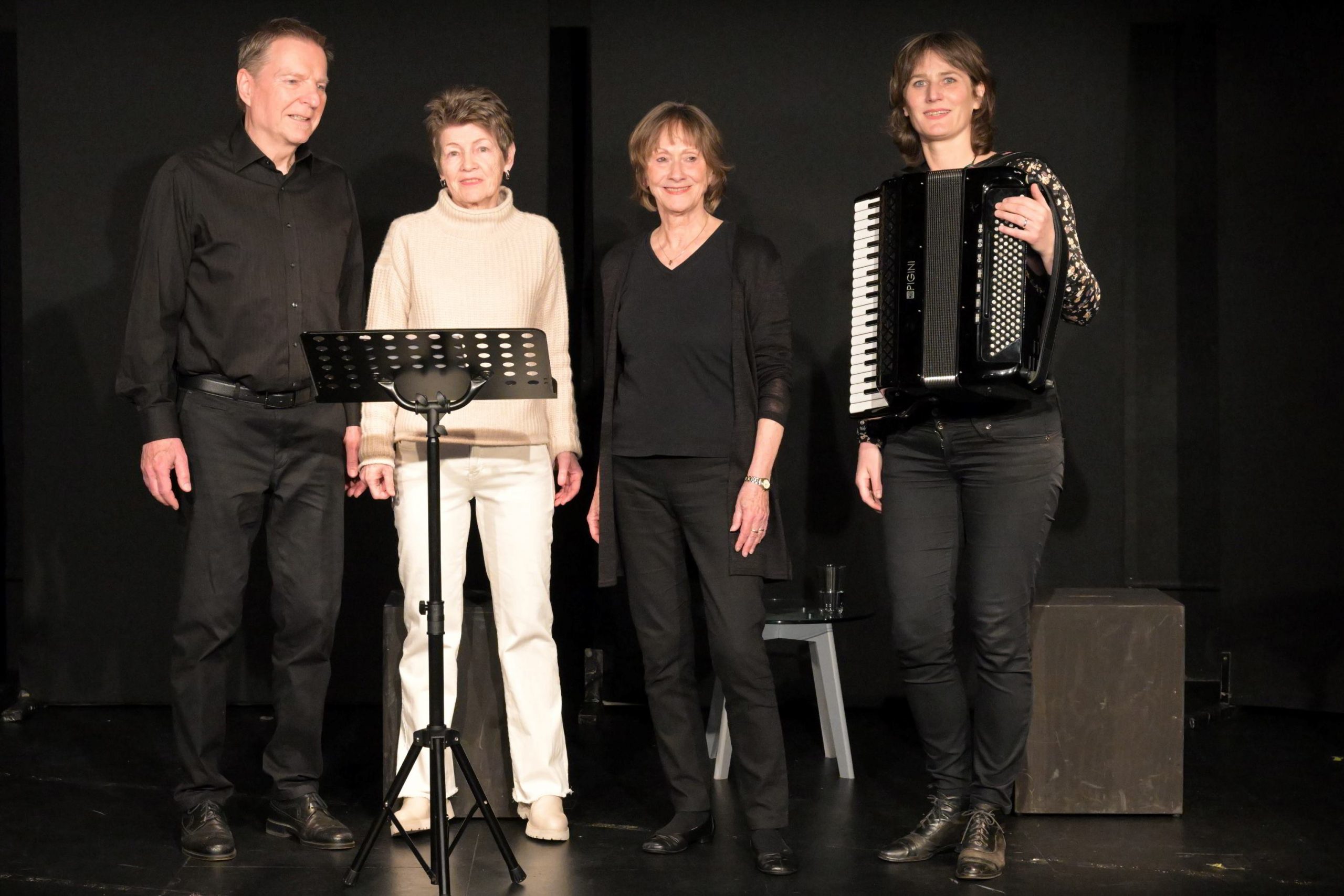 Ein Kulturabend, der eindrucksvoll berührt hat. Die ca. 40 Gäste im Pfarrsaal von Herz Jesu in Schildgen ließen sich von der faszinierenden Sprech- und Schauspielkunst der Romanautorin Marianne Tieves sowie von Petra Christine Schiefer, Uwe Grede und der Akkordeon-Spielerin Dorrit Bauerecker in den Bann ziehen.Im Mittelpunkt steht die Geschichte der