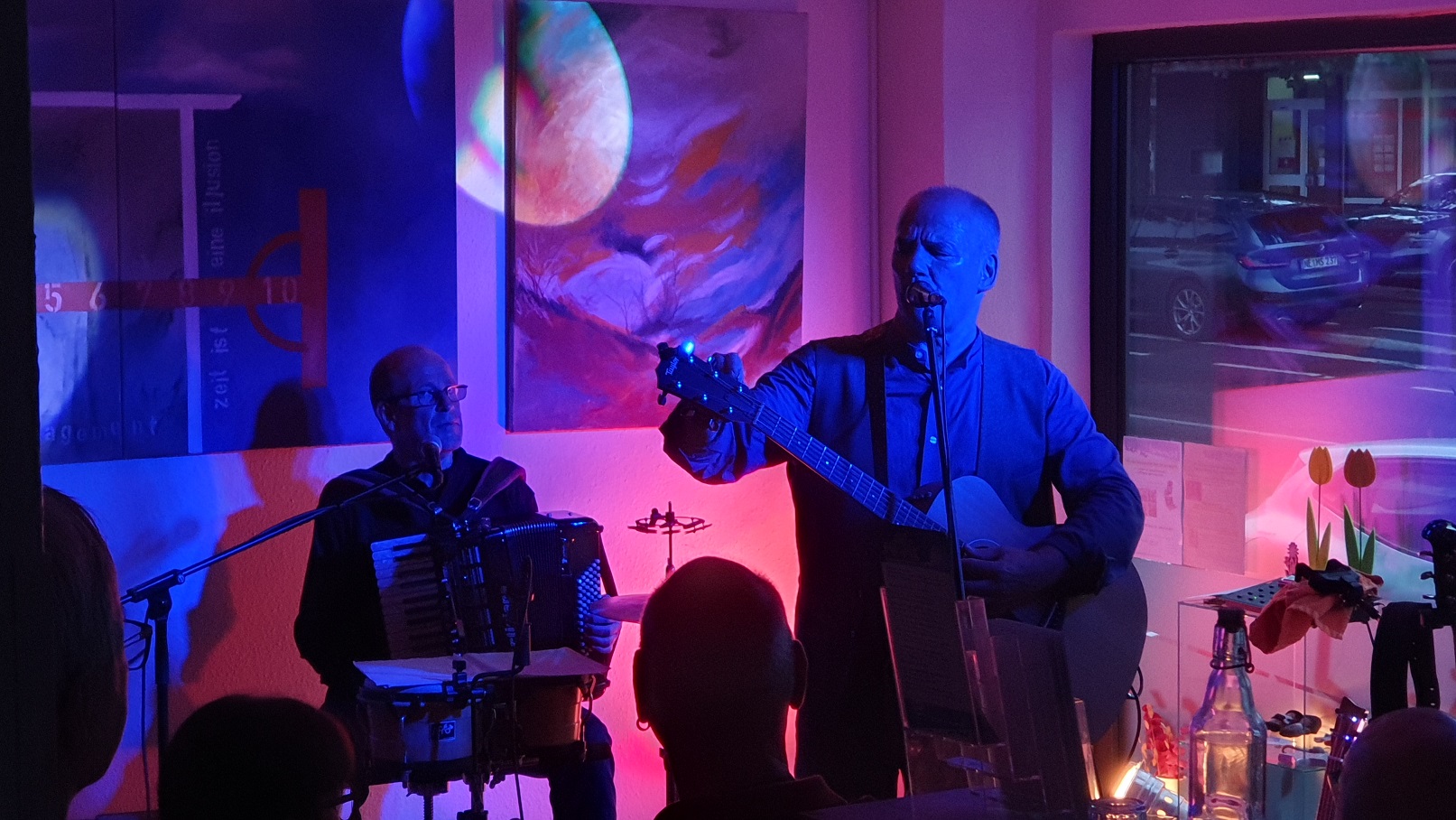 Das Café war komplett ausverkauft – es war eng, aber voller Energie. Malcolm Shuttleworth, der charismatische englische Singer/ Songwriter, rockte mit seinem Soloprogramm die Bühne – begleitet von seinem langjährigen Musikpartner und Freund Frank Beilstein