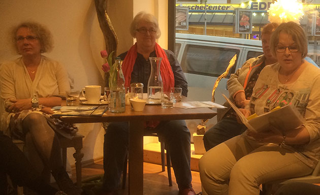 Ein launischer Aprilabend, an dem sich 7 kreativ-schreibende Frauen im Café einfinden. Für Musik ist mit Klavier und Querflötentönen auch gesorgt.Geboten wird u.a. Lyrisches zum Lenz, Legenden aus Wörtern und auch Geschichten rund um Alltagsgegenstände. Schreibanlässe bieten sich immer und mit Allem an.Strichmännchen werden lebendig oder auch zu Engeln.Wir bedanken