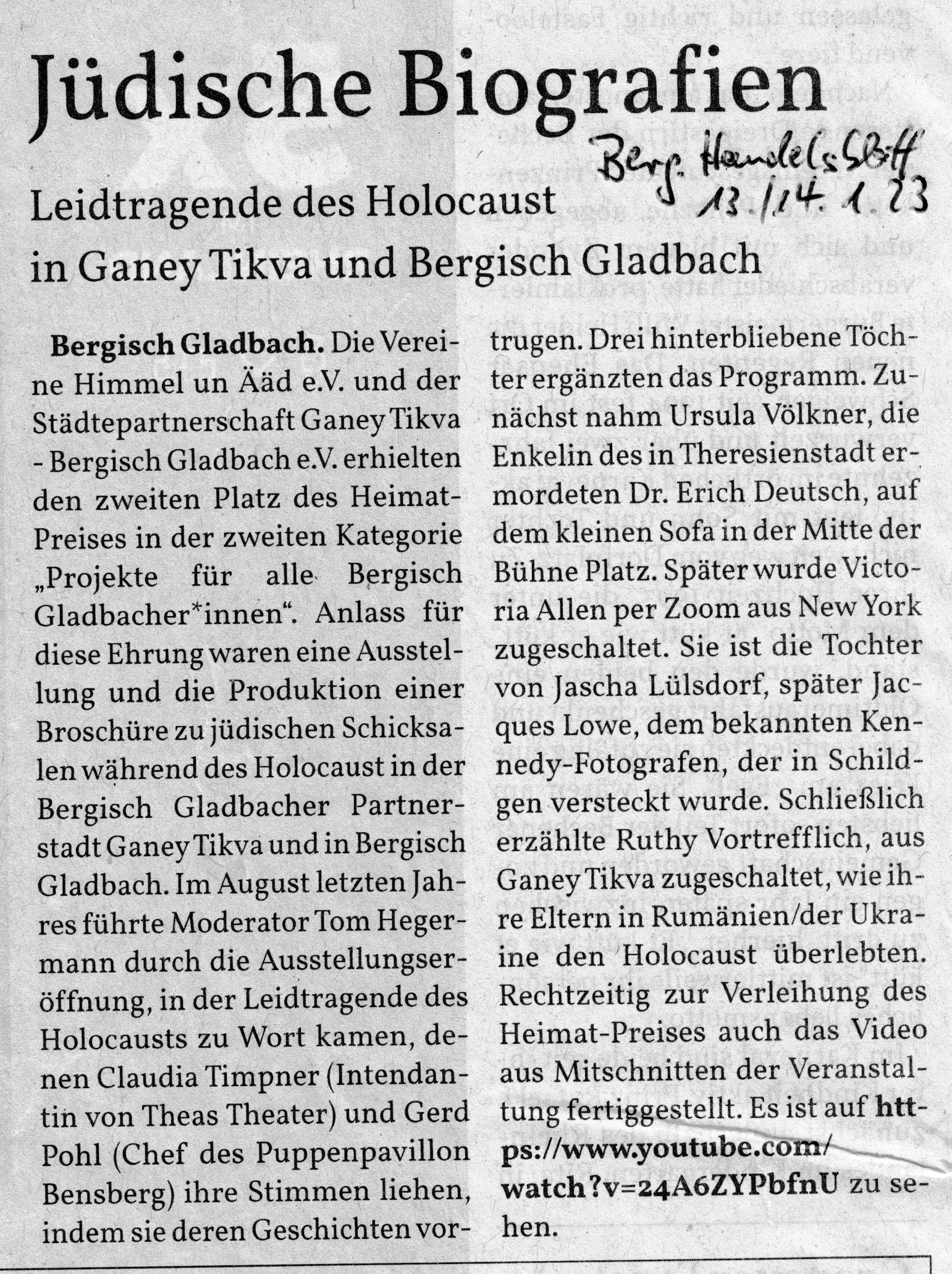 Wir freuen uns sehr über den 2. gemeinsamen Platz beim „Heimatpreis 2022“ mit dem Ganey Tikva Städtepartnerschaftsverein für unser Kooperationsprojekt „Jüdische Biografien in Ganey Tikva und Bergisch Gladbach“