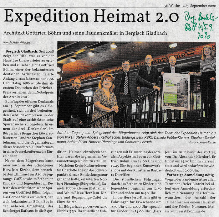 Am 13. September machte die Böhm-Veranstaltungsreihe „Expedition Heimat 2.0“ Station in der Herz Jesu-Kirche in Schildgen. Im Rahmen des “Tags des offenen Denkmals” nahmen 120 Gäste an fünf ausgebuchten Veranstaltungen unter Einhaltung der Corona-Regeln teil. Klar wurde: Böhms kühner Kirchen-Entwurf ist längst zu einer Landmarke geworden.