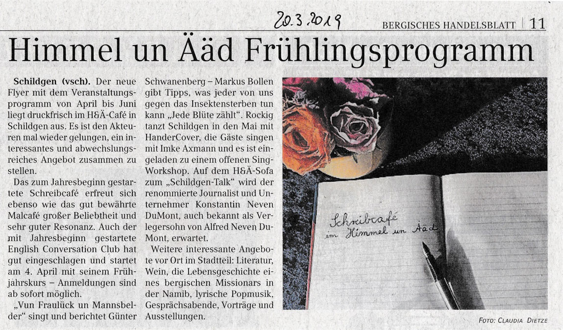 Der neue Flyer mit dem Veranstaltungsprogramm von April bis Juni liegt druckfrisch im H&Ä-Café in Schildgen aus.