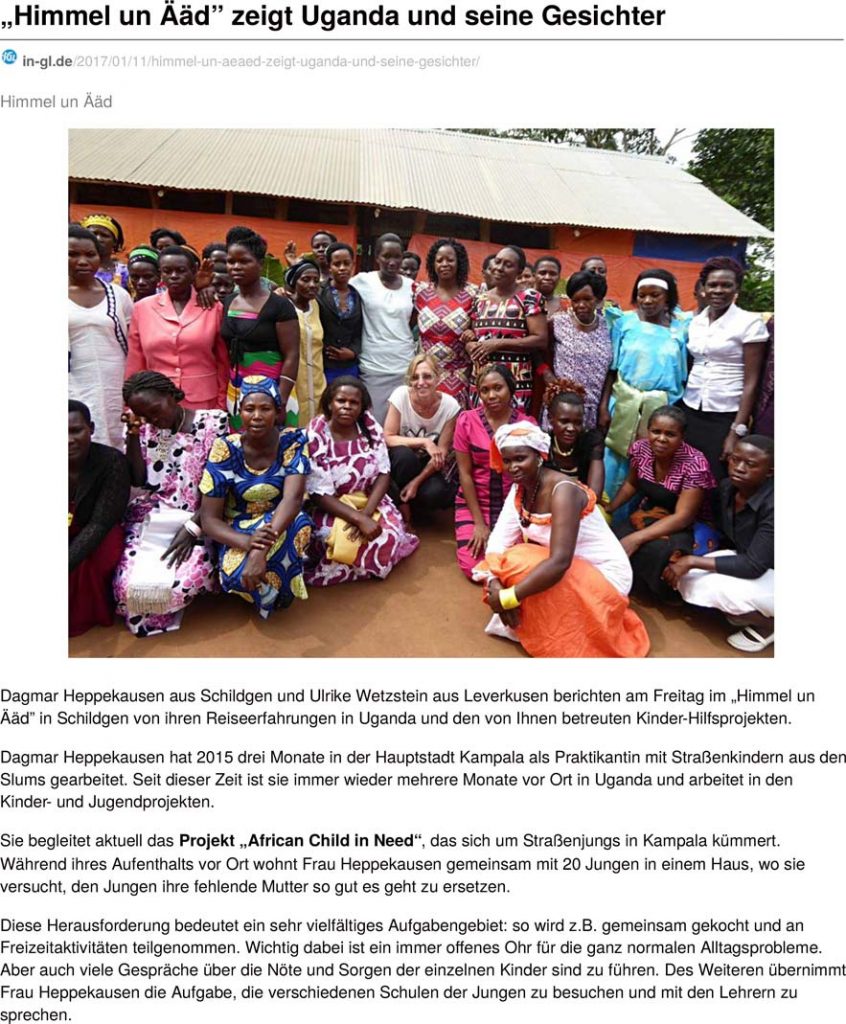 Dagmar Heppekausen aus Schildgen und Ulrike Wetzstein aus Leverkusen berichten von ihren Reiseerfahrungen in Uganda und den von Ihnen betreuten Kinder-Hilfsprojekten – am 13.1.; 19:30 im H&Ä