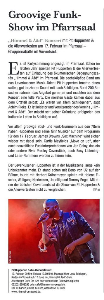 Es ist Party-Stimmung angesagt. „Himmel-un-Ääd“-Konzert mit Pit Hupperten und die Allerwertesten am 17. Februar im Pfarrsaal.