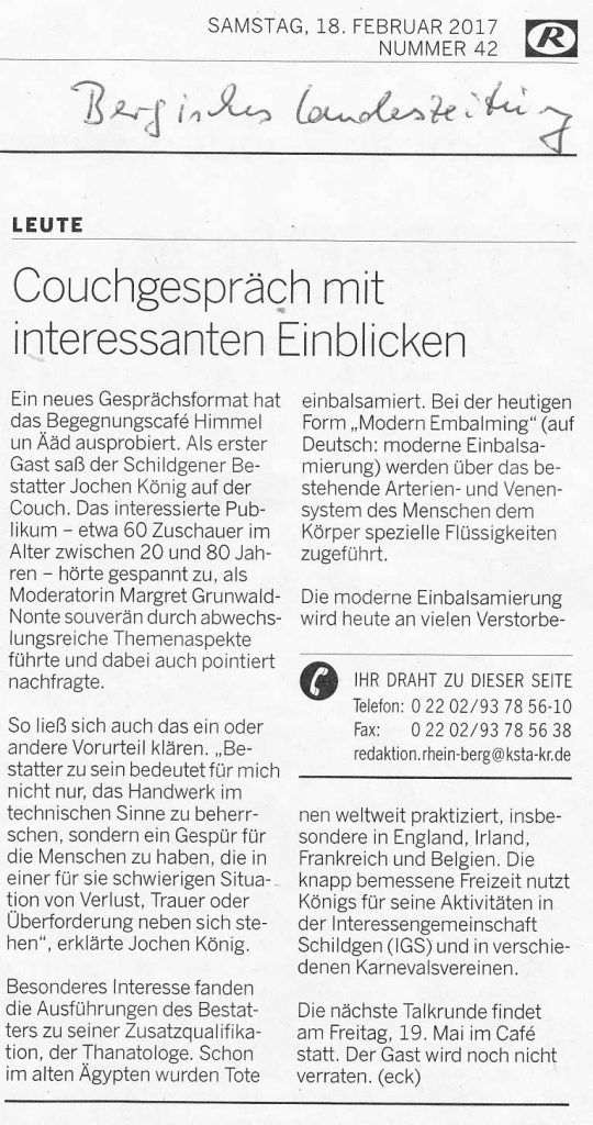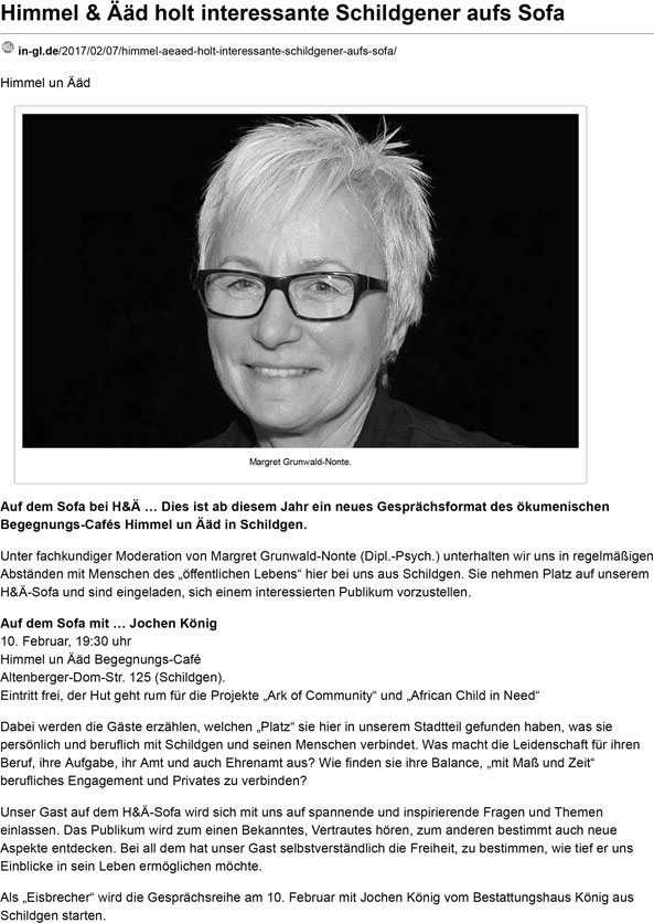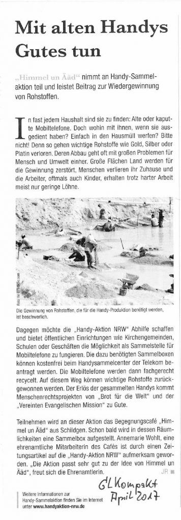 Der Himmel un Ääd e.V. hat sich und das ökumenische Begegnungs-Café in Schildgen genau vor zwei Jahren am 17.04.2015 gegründet. Das Café Himmel-un-Ääd sieht sich als ein Raum des Gespräches, der Begegnung, kultureller und sinnstiftender Treffpunkt in der Mitte des Ortes, bereichert aber auch die Veranstaltungslandschaft Schildgens, ganz Bergisch Gladbachs und des Umlandes.