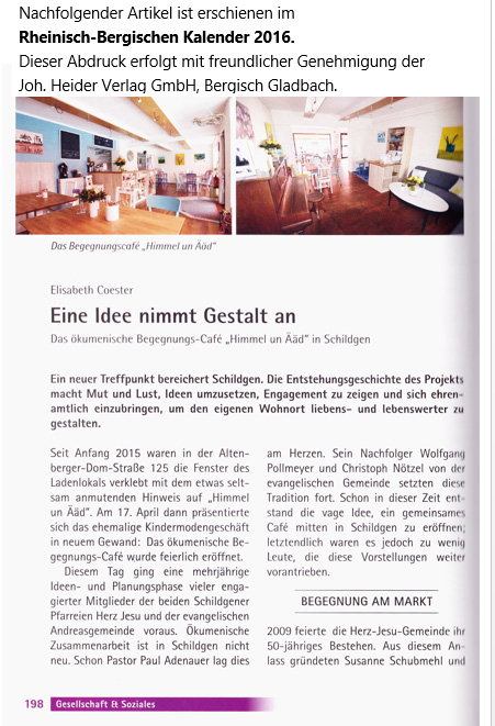 Unser ökumenisches Begegnungs-Café in Schildgen ist rein ehrenamtlich-bürgerschaftlich getragen und versteht sich als Ort der Begegnung und des Gesprächs, als ein kultureller und sinnstiftender Treffpunkt in der Mitte von Schildgen: offen, niederschwellig und kommunikativ.