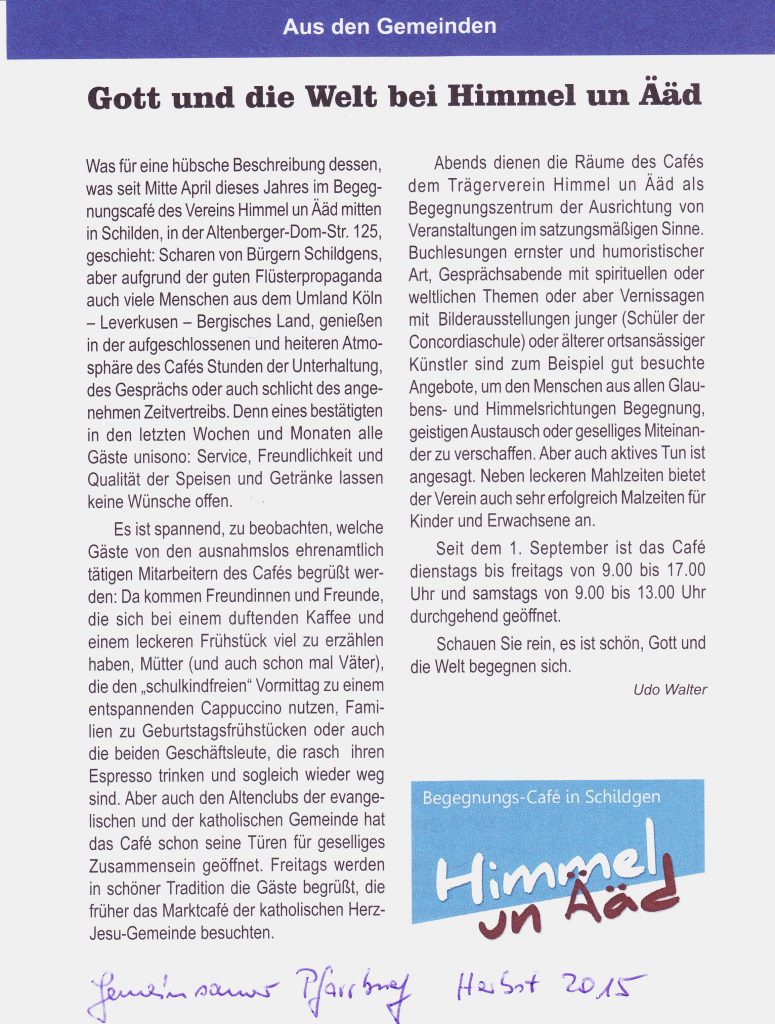Unser ökumenisches Begegnungs-Café in Schildgen ist rein ehrenamtlich-bürgerschaftlich getragen und versteht sich als Ort der Begegnung und des Gesprächs, als ein kultureller und sinnstiftender Treffpunkt in der Mitte von Schildgen: offen, niederschwellig und kommunikativ.
