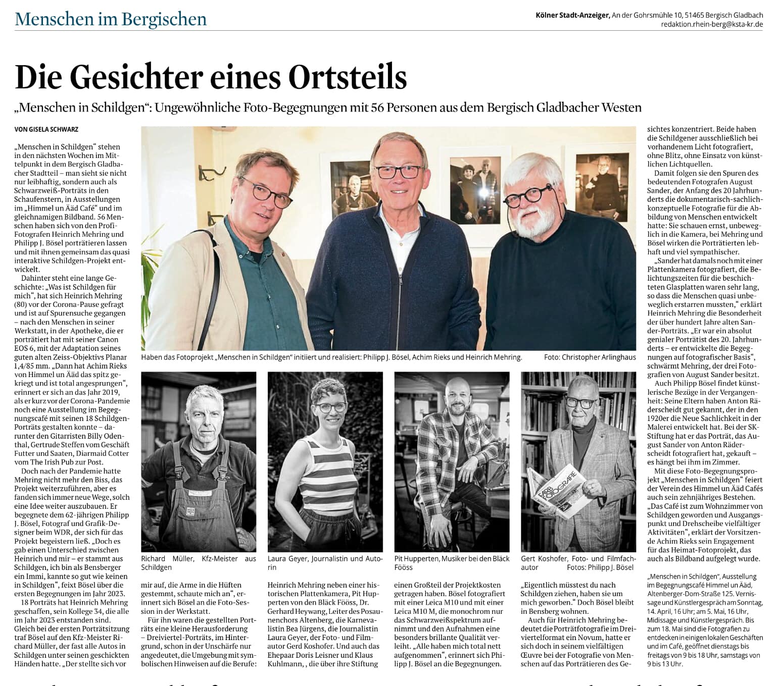 „Menschen in Schildgen“ stehen in den nächsten Wochen im Mittelpunkt in dem Bergisch Gladbacher Stadtteil – man sieht sie nicht nur leibhaftig, sondern auch als Schwarzweiß-Portraits in den Schaufenstern, in Ausstellungen im Himmel un Ääd-Café und im gleichnamigen Bildband.