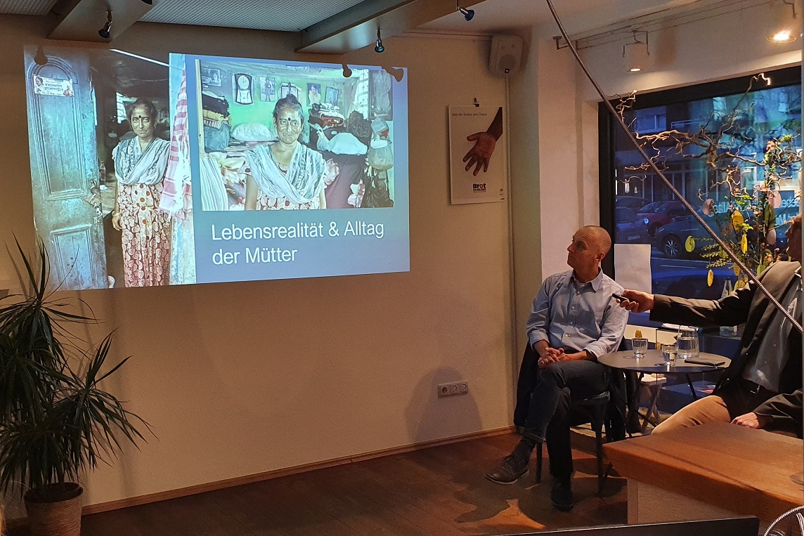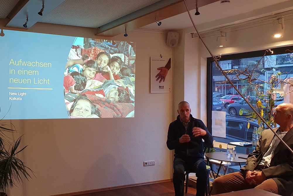 Zum Abschluss des aktuellen H&Ä-Quartalsprojektes „New Light“ berichtete Urban Philippek von der BONO-Direkthilfe e.V. im Himmel un Ääd-Begegnungscafé über das wichtige Engagement und die Arbeit dieses BONO-Partnerprojektes im Rotlichtviertel von Kolkata (Kalkutta – Indien). Seit dem Jahr 2000 arbeitet New Light für die Kinder von Frauen, die in der Prostitution leben. Die Kinder, die in den Rotlichtvierteln aufwachsen, müssen oft miterleben, wie ihre Mütter ihrer Arbeit nachgehen. Sie sind einem starken sozialen Druck ausgesetzt, werden ausgegrenzt und stigmatisiert. In der unmittelbar an das Rotlichtviertel angrenzenden und von New Light betriebenen Tages- und Nachtstätte werden ca. 200 Kinder betreut. New Light organisiert den Schulbesuch einschließlich der Hausaufgabenbetreuung, gewährleistet die medizinische und psychologische Versorgung und die regelmäßige Ernährung. „Jede Minute, die ein Mensch in Würde lebt, gibt ihm Halt und Sicherheit“ (Urban Philippek, Projektkoordinator New Light bei der BONO-Direkthilfe).