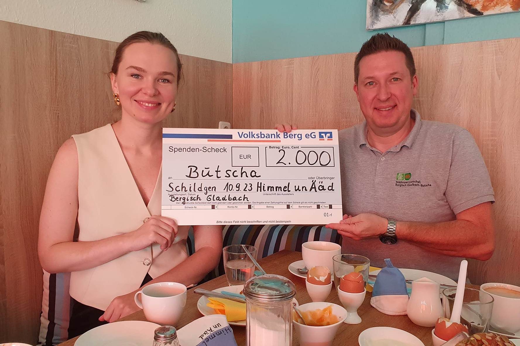 Wir haben uns sehr gefreut, Alina und Frank Haag, dem Vorsitzenden der Städtepartnerschaft Bergisch Gladbach – Butscha, einen symbolischen Scheck aus den großzügigen Trinkgeldern und Spenden unserer Besucher für den nächsten – mittlerweile 7. – Hilfskonvoi nach Butscha überreichen zu können. „Davon beschaffen wir neue Spielgeräte und statten zwei Klassenzimmer vollständig mit Möbeln und Medien aus”, beschreibt Frank Haag die aktuellen Vorbereitungen.