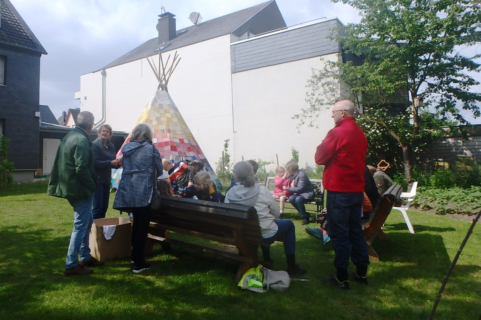Vier Bänke standen noch von der „Zugabe“ am letzten Samstag kreisförmig zusammen. Ideal, um Modelle von Larven und Bienen, Mittelwände und Wachsstückchen herumzugeben. Honig wurde probiert, Schleier aufgesetzt.