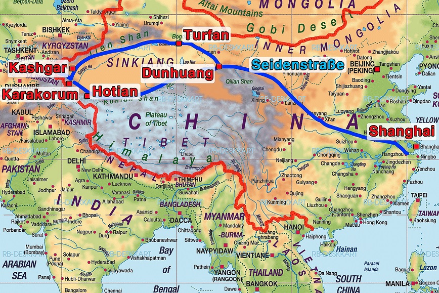 Nach einem kurzen Stopp in Shanghai ging die Reise von Dunhuang über Turfan und Hotian nach Kashgar und von dort über den Karakorum Highway bis nach Taschkurgan in die Grenzregion zu Pakistan und Afganistan.