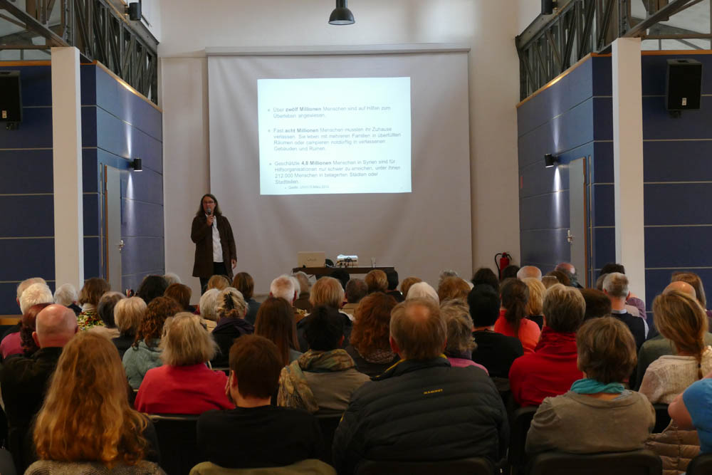 Syrien – ein Land im Untergang, so wurde die Vortrags- und Diskussions-veranstaltung mit der Syrien-Expertin Larissa Bender angekündigt und ca. 80 Interessierte haben den Weg in den Pfarrsaal der Herz Jesu Gemeinde in Schildgen gefunden.