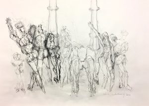 Die andere Werkgruppe besteht aus Zeichnungen, die in Zusammenarbeit mit Tänzerinnen und Musik entstanden sind. Es sind Aktionen auf Papier. Linien, die manchmal fließen – aber auch springen, stottern und suchen, während sie die ständig in Veränderung befindlichen Bewegungen von Tänzern auf Papier bringen. Ein ergebnisoffener Prozess.