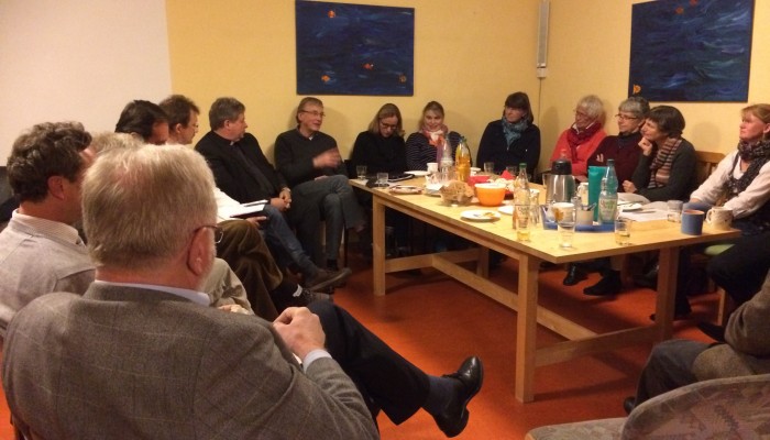 Vor dem Hintergrund des ökumenischen Geistes des unabhängigen Himmel-un-Ääd-Begegnungs-Cafés trafen sich die Mitglieder von H&Ä-Vorstand und -Projektteam mit Vertretern des Generalvikariats Köln, der Ev. Landeskirche Rheinland sowie den beiden Orts-Pfarrern Darscheid und Kotthaus zu einem Kennenlernen und Gedankenaustausch. Vom Generalvikariat war Herr Prälat Radermacher und für die Ev. Landeskirche Pfarrer Nötzel in den Gemeindesaal von Andreas gekommen.