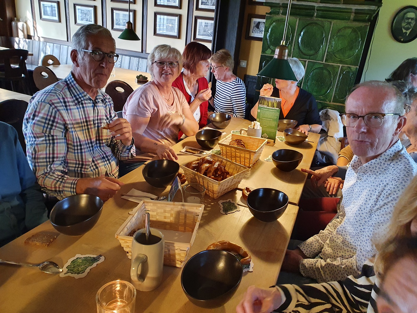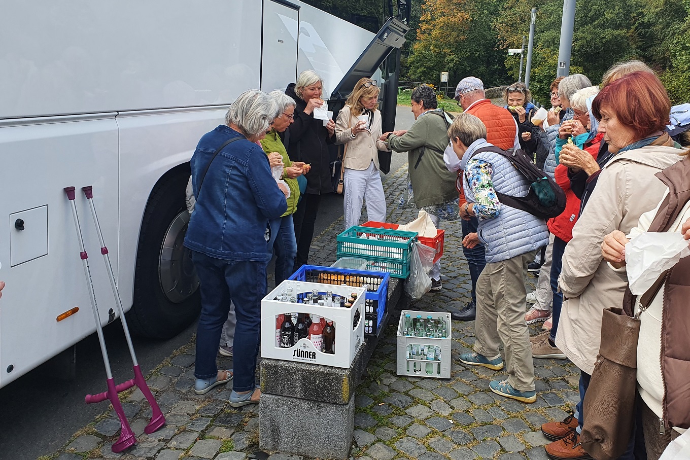 Schön, dass so langsam die Sonne herauskam – und schön, dass gute Geister viele leckere Brötchen geschmiert und eingepackt hatten, mit Obst und Getränken. So konnten wir bei zünftigem „Pausenbrot“ am Bus den ersten Hunger des Tages stillen.