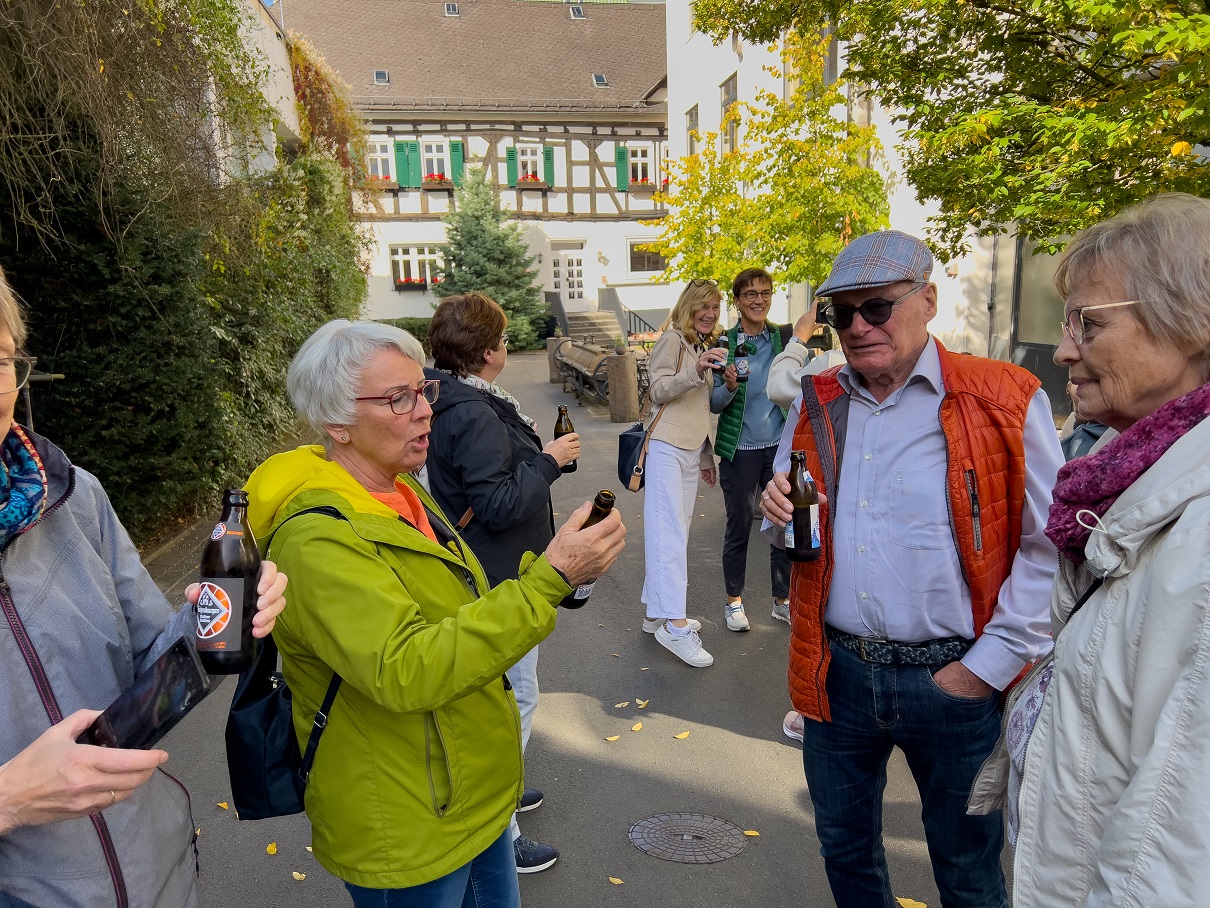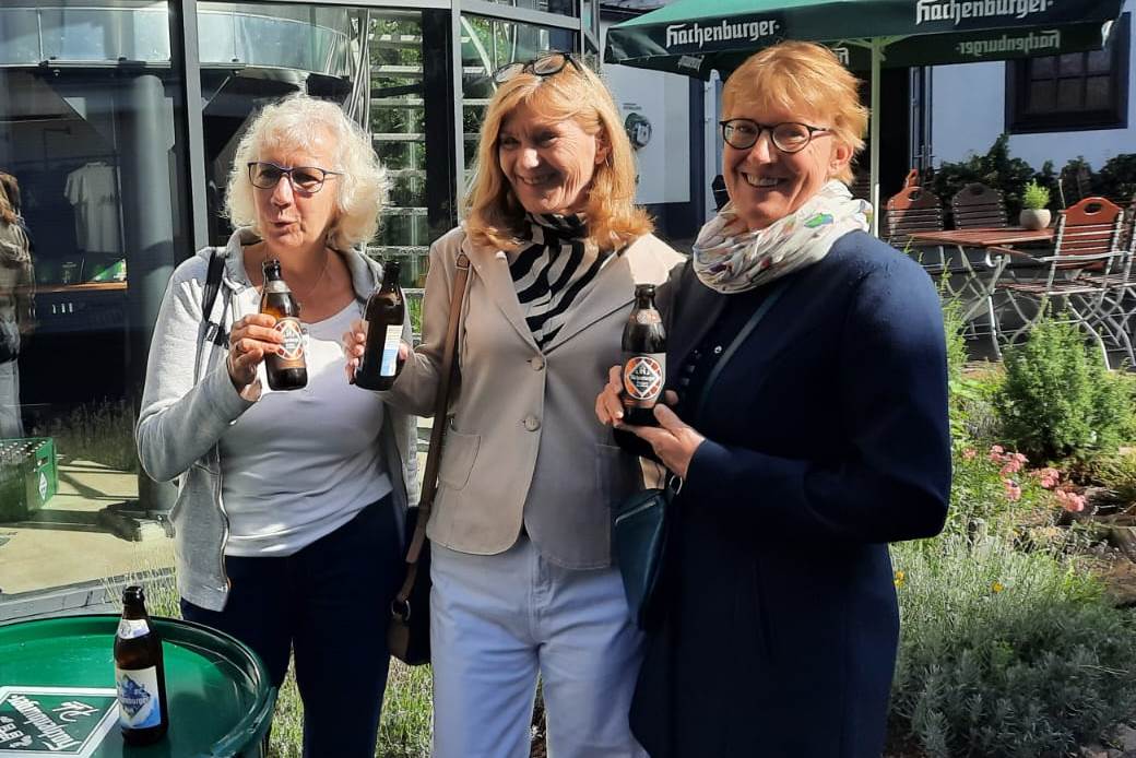 Weiter ging´s zur Hachenburger Brauerei, wo wir zunächst das obligatorische Gruppenfoto machten und von Carla von Bibra-Schneider und Heiner Schneider, den Brauereibesitzern, herzlich begrüßt wurden. Gemeinsam mit Dr. Anke Strenge-Hesse und ihrem Mann Prof. Dr. Albrecht Hesse haben sie vor Jahren den „Kinderheim und Dorfambulanz Südindien e.V.“ gegründet und unterstützen die Arbeit vor Ort in Indien auf vielfältige Weise. Auf Vermittlung durch unsere H&Ä-Ehrenamtlerin Dagmar Ibe, eine „alte Freundin“ von Ehepaar Schneider, haben wir bei Himmel un Ääd im Rahmen unseres internationalen Quartalsprojektes im 2. Quartal diesen Jahres aus den Trinkgeldern unserer Gäste, unserem Cafébetrieb, den Spenden aus einem Benefizkonzert des A-Tempo Chores mit den beiden Bands „krausam“ und „Pfingst“ sowie mit Unterstützung des Bergisch Gladbacher Stadtverbandes Eine-Welt die tolle Spendensumme von 4.000 Euro zusammengebracht.