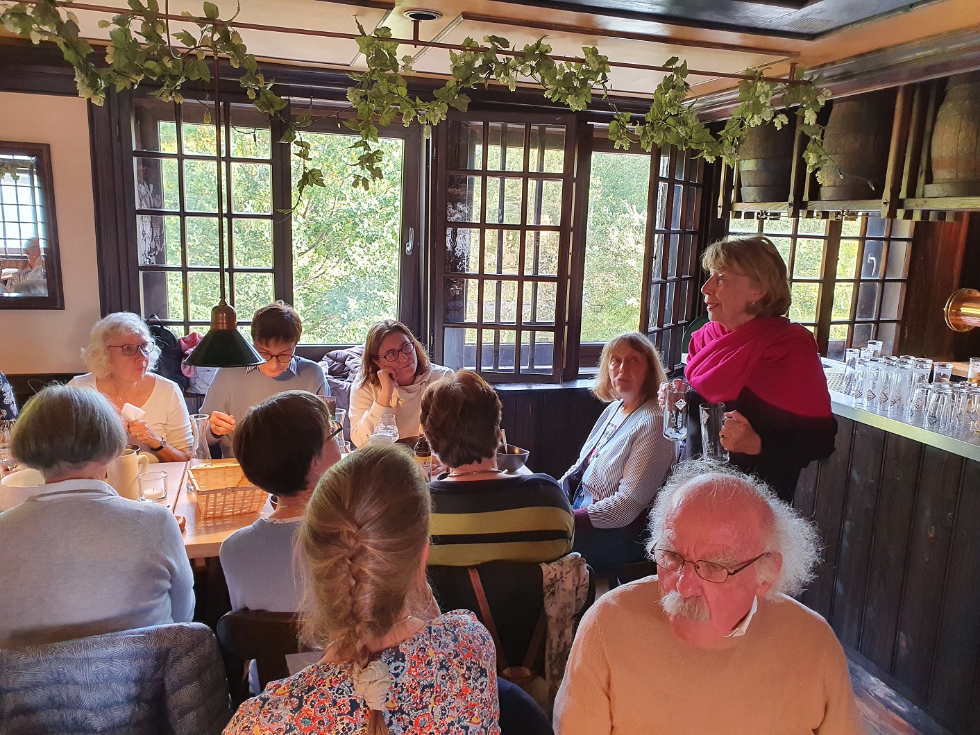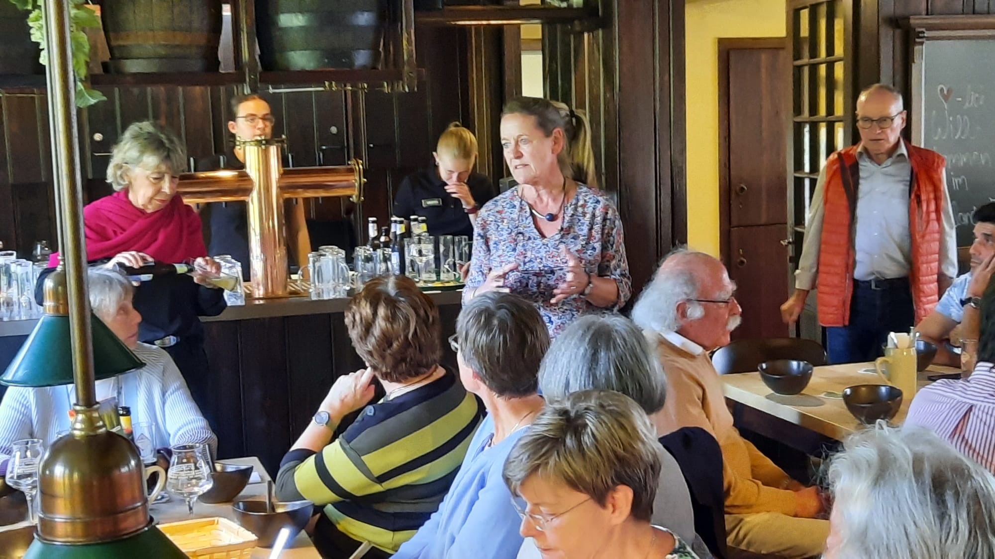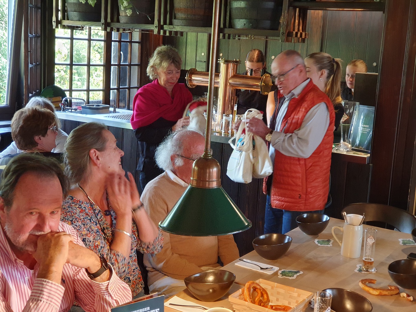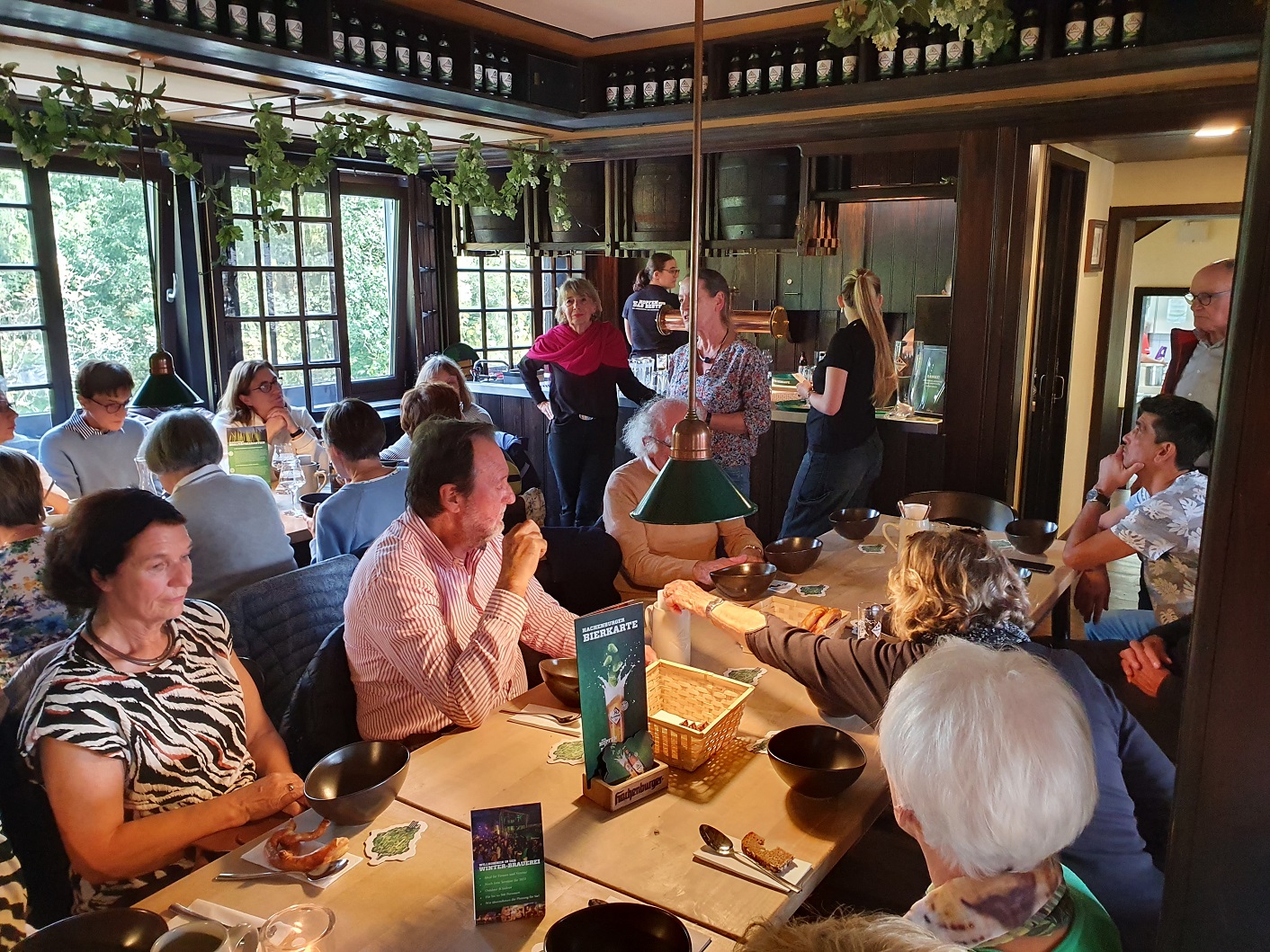 Im Anschluss an die beeindruckende Tour durch die Brauerei waren wir eingeladen in den Schalander – früher der Raum in einer Brauerei, in dem sich die Arbeiter umziehen und während der Pausen aufhalten; heute oft ein Raum für Bierverkostung und gemütliches Beisammensein. Hier wurden wir mit der typischen Hachenburger Kartoffelsuppe, Bier und anderen Köstlichkeiten bewirtet. Anke berichtete über die Aktivitäten, die in Indien mithilfe unserer Spende angestoßen und bereits auch schon teilweise umgesetzt wurden, und Udo überreichte unsere Schildgener Gastgeschenke – unseren fairen Bio „Schildgen-Café“, „Schildchen Bräu“ und Tee und Süßes aus unserem Eine-Welt-Verkauf.
