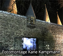 Diese in der Architektur aufscheinenden Gegensätze sind Ausgangspunkt der multimedialen Lichtinstallation „OKZIDENT TRIFFT ORIENT“ von Kane Kampmann. Sie interpretiert die einzigartige Architektur von Gottfried Böhm als Gesamtkunstwerk und greift dabei sowohl formale als auch inhaltliche Aspekte auf.