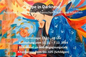 Die von terre des hommes, Aktion Neue Nachbarn, Evangelische Kirchengemeinde Altenberg/Schildgen, dem Himmel & Ääd-Begnungscafé und dem Stadtverband Eine Welt Bergisch Gladbach e.V. präsentierte Ausstellung „Hope in Darkness“ zeigt Werke von afghanischen Mädchen und Frauen, die in ihren Bildern ihre Erfahrungen unter dem Taliban Regime, Gefühle, Wünsche und Forderungen zum Ausdruck bringen.