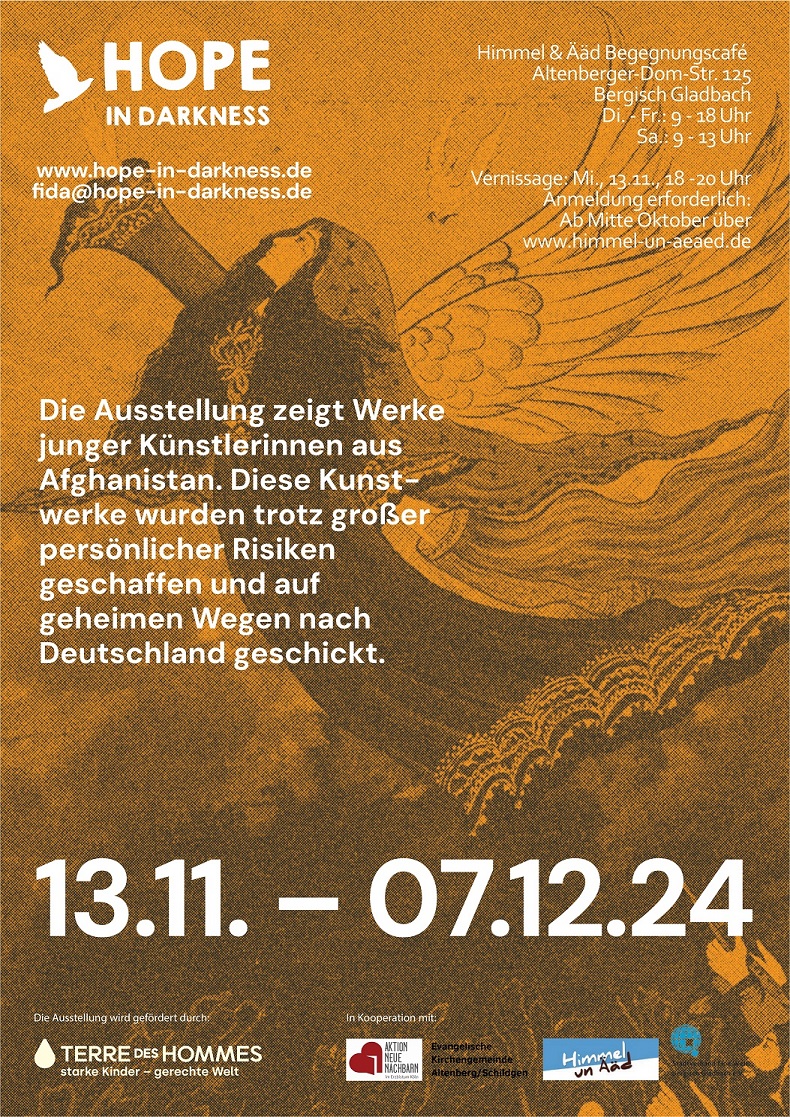 Die von terre des hommes, Aktion Neue Nachbarn, Evangelische Kirchengemeinde Altenberg/Schildgen, dem Himmel & Ääd-Begnungscafé und dem Stadtverband Eine Welt Bergisch Gladbach e.V. präsentierte Ausstellung „Hope in Darkness“ zeigt Werke von afghanischen Mädchen und Frauen, die in ihren Bildern ihre Erfahrungen unter dem Taliban Regime, Gefühle, Wünsche und Forderungen zum Ausdruck bringen.