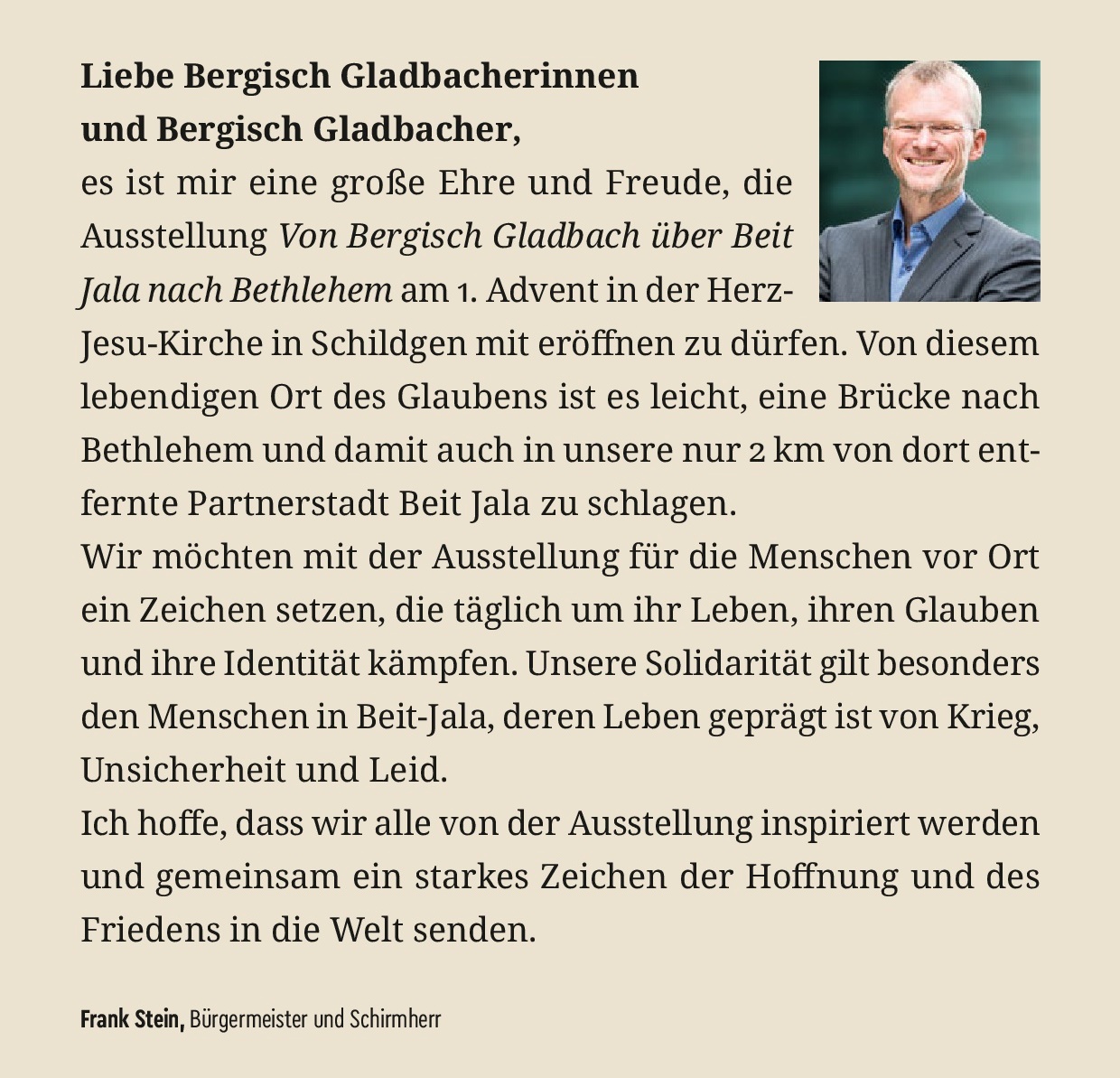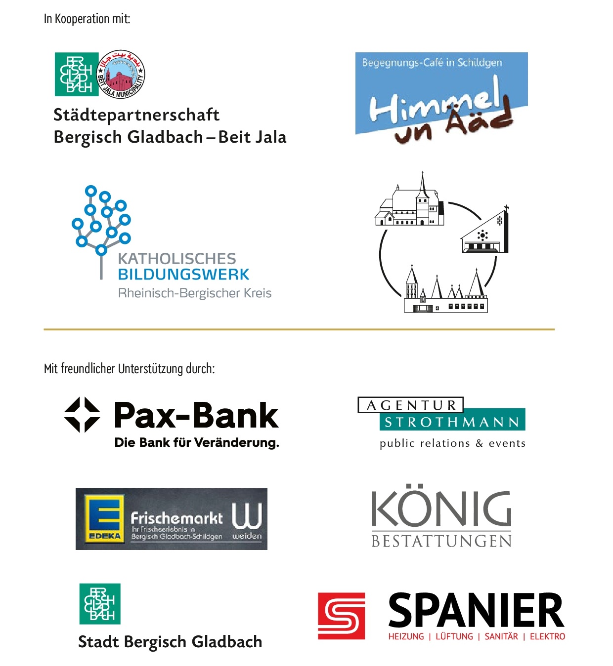 Ein aufwändiges Vorhaben, das der Städtepartnerschaftsverein Bergisch Gladbach-Beit Jala e.V. in Kooperation mit der Katholischen Pfarreiengemeinschaft Bergisch Gladbach-West, dem Himmel un Ääd-Begegnungscafé und dem Katholischen Bildungswerk Rhein-Berg auf die Beine stellt.