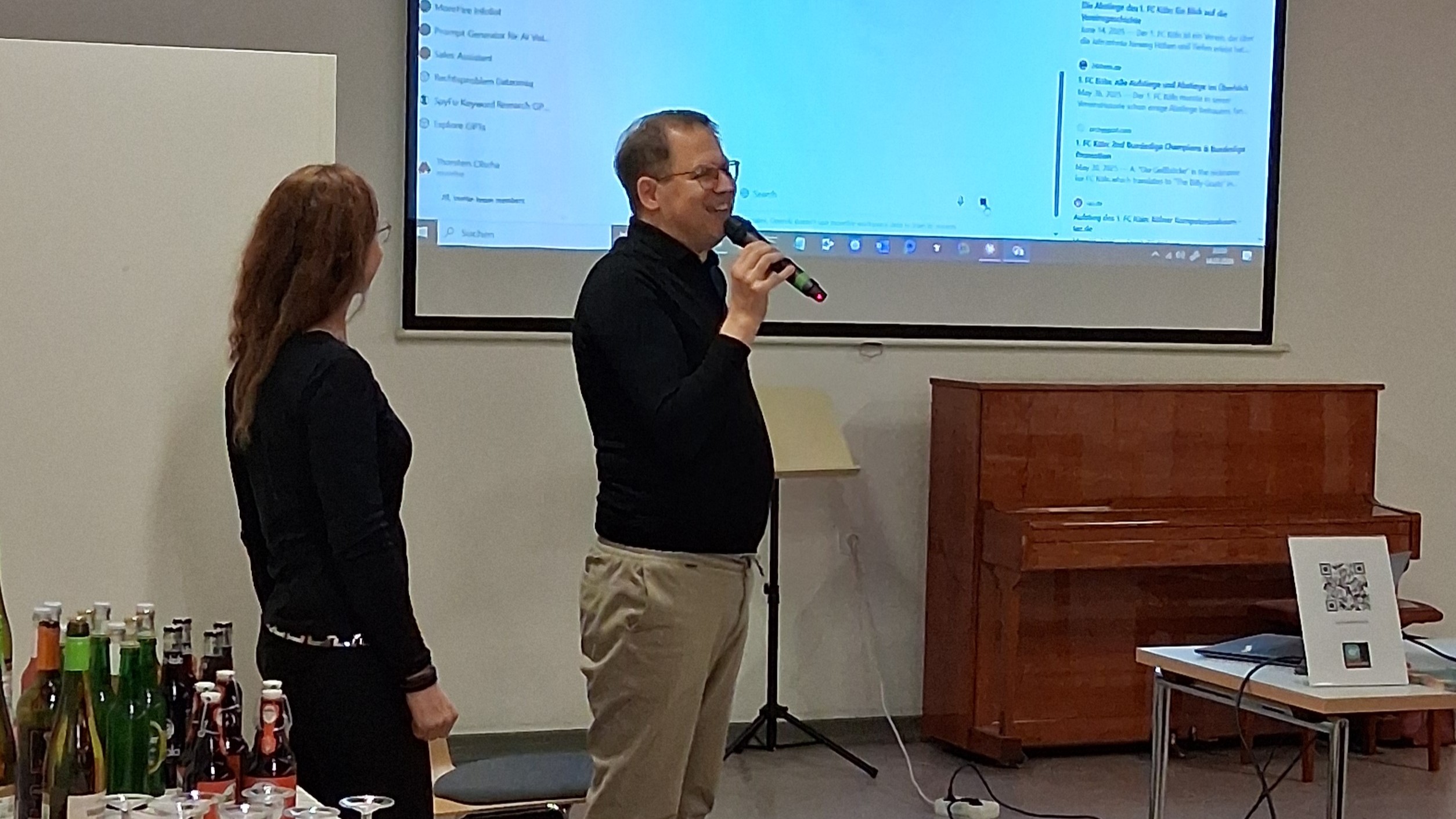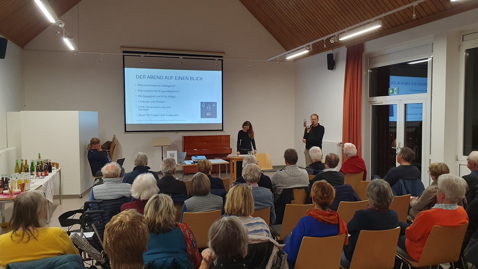 Auf großes Interesse stieß unser KI-Infoabend „KI in aller Munde“ im Gemeindesaal der Andreaskirche. Thomas Flintrop aus unserer IT-Sprechstunde hatte angeregt, zu diesem immer mehr an Bedeutung gewinnenden Thema eine Veranstaltung anzubieten. So hatten wir den KI-Experten Thorsten Olscha (morefire) und die Moderatorin Jeannette Graf (Scylla Akademie) eingeladen, eine Einführung in KI, ChatGPT & Co. zu geben und Fragen rund um Technik, Nutzung und Ethik der Künstlichen Intelligenz zu beantworten.