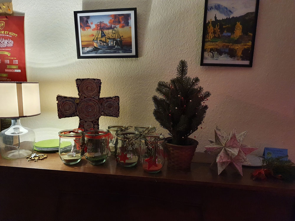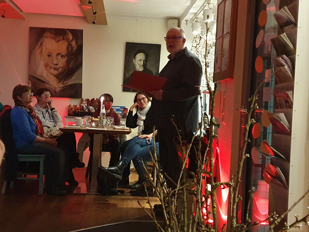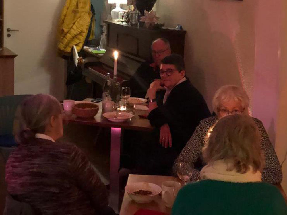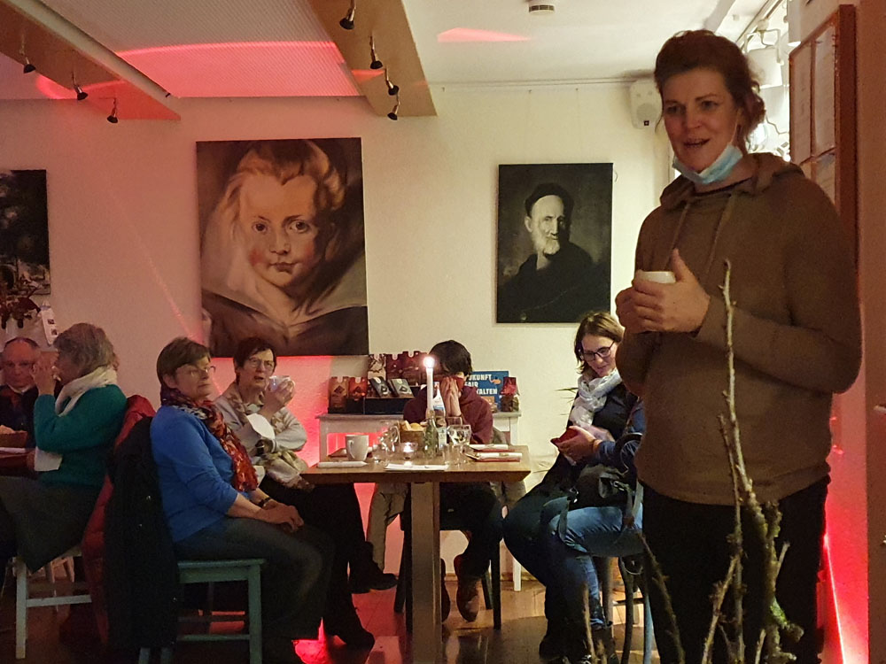 Vanessa hatte spontan umdisponiert und alles gut und liebevoll vorbereitet – die Tische waren festlich gedeckt, Kerzen brannten, dezente farbige Strahler tauchten das Café in schönes Licht und schufen eine feierliche Atmosphäre. Nach Vanessas Begrüßung brachte Richard auf perfektem Kölsch und mit unerwarteten Einzelheiten die Weihnachtsgeschichte vum Evanjelist Lukas zum Vortrag – es wurde viel geschmunzelt.