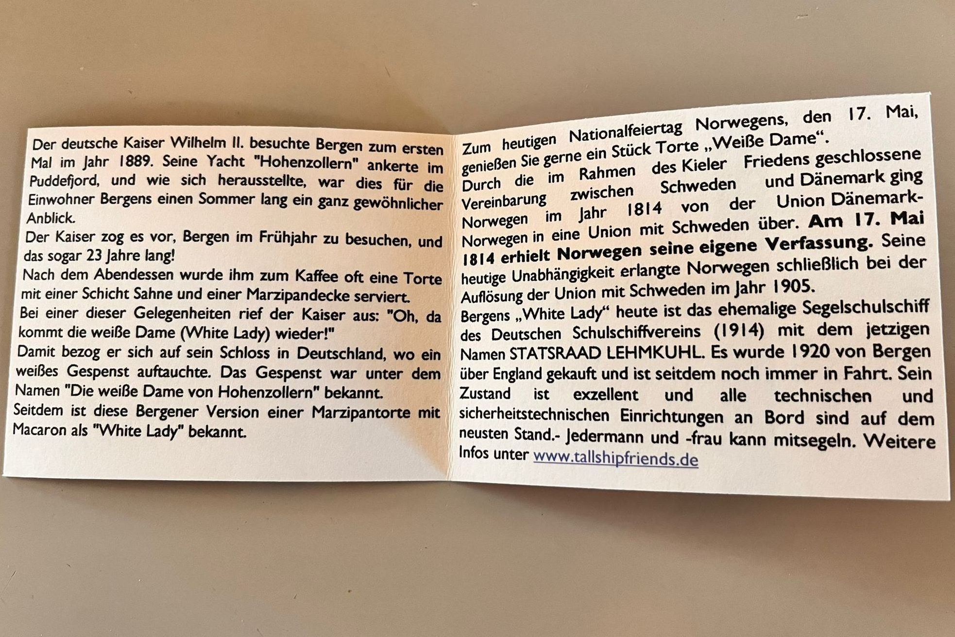 Der Name White Lady stammt von Kaiser Wilhelm II, der mit seiner Yacht Hohenzollern 23 Jahre lang im Frühjahr in Bergen urlaubte. Er nannte die Torte, welche ihm nach dem Mittag gereicht wurde, Weiße Dame, nach einem Schlossgespenst auf der Hohenzollernburg.