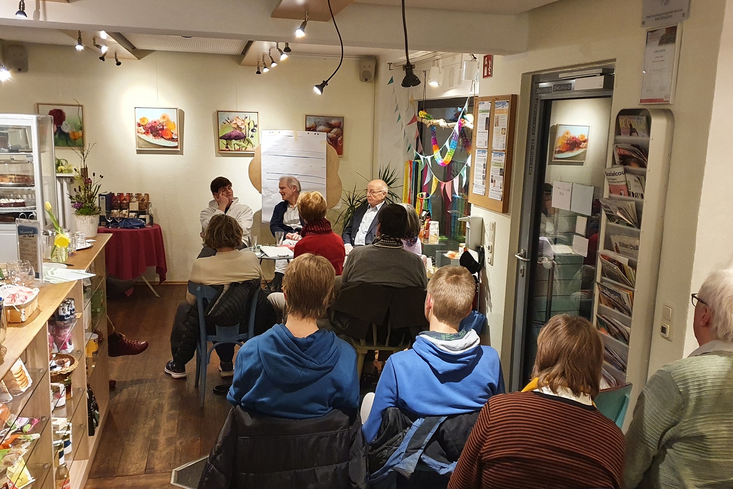 Im folgenden lebhaften Gespräch im vollen H&Ä-Café wurde die relative Zufriedenheit im persönlichen Leben deutlich. Die Frage entstand, wie das angesichts der „Weltlage“ aufrecht erhalten werden kann und wie es vielen Menschen gelingt, diese Gefahren (Klimakrise, Naturkatastrophen, Kriege) auszublenden und sich auf das Private zurückzuziehen. Hier machte vor allem die junge Generation deutlich, was man tun kann und wie viel einfacher und schöner es ist, gemeinsam zu handeln.