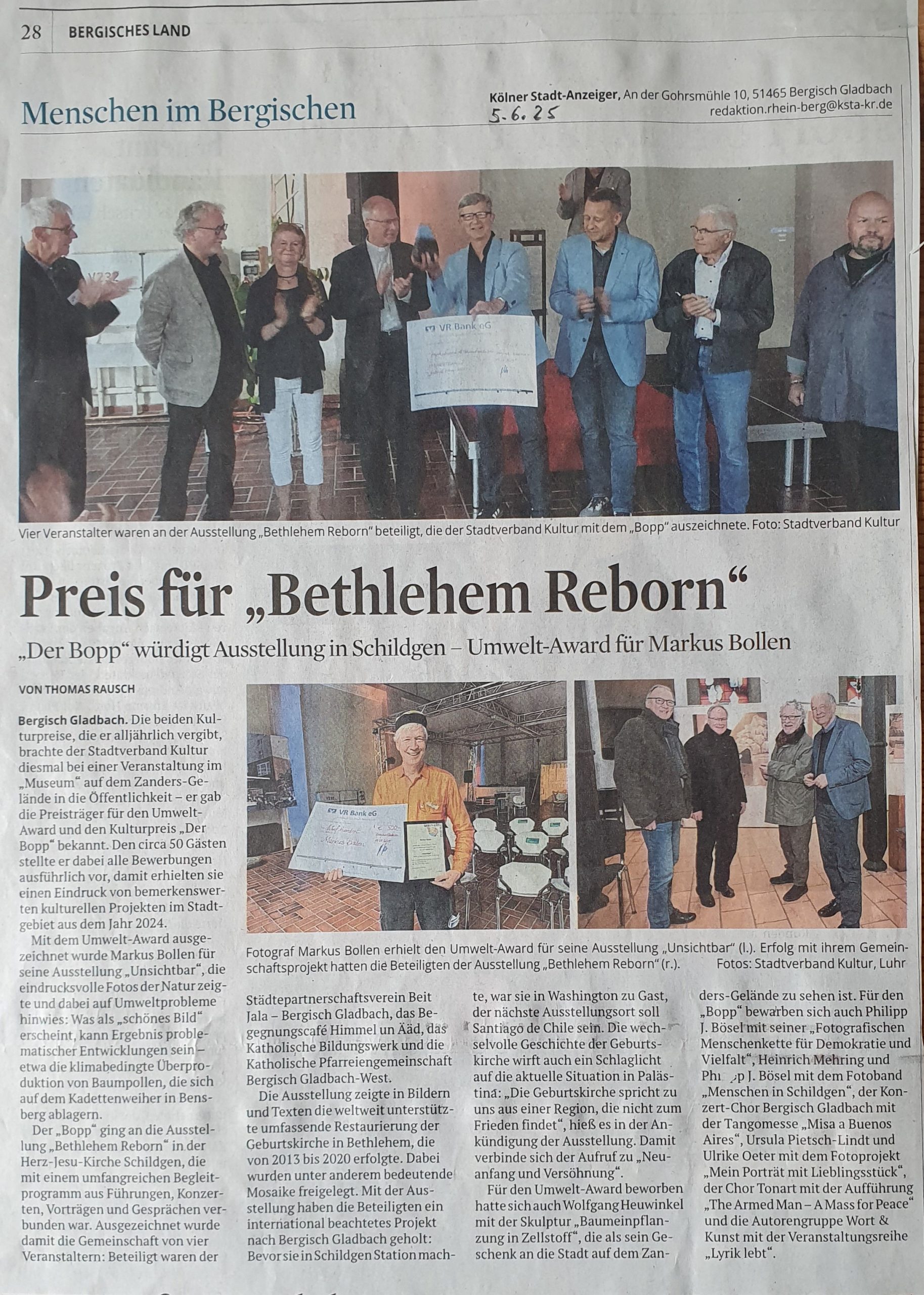 Für unser Kooperationsprojekt „Bethlehem reborn – die Geburtskirche“, ein Ausstellungs- und Veranstaltungsprojekt der Städtepartnerschaft GL-Beit Jala, der Pfarreiengemeinschaft Bergisch Gladbach West, des Kath. Bildungswerkes Rhein-Berg und Himmel un Ääd hat uns der „Stadtverband Kultur“ mit dem alljährlich verliehenen Wanderpreis „DER BOPP“ als Anerkennung für dieses besondere kulturelle Engagement und als Ansporn für unsere zukünftige Kulturarbeit in unserer Stadt ausgezeichnet.
