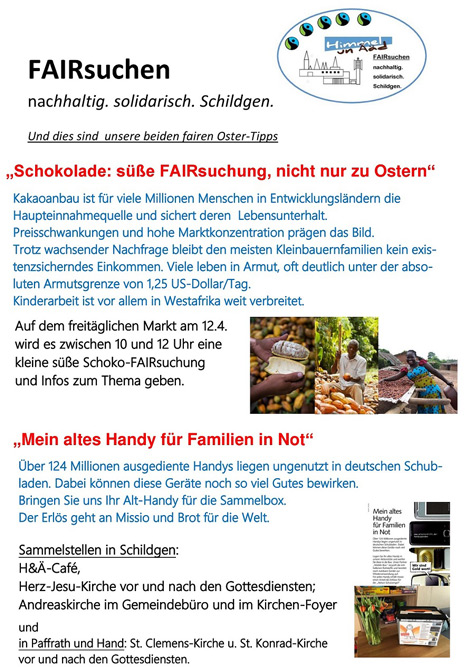 So wird die Fairtrade-Steuerungsgruppe der Stadt am 10.4. ab 11 Uhr einen fairen Schokogruß auf dem Bergisch Gladbacher Wochenmarkt verteilen. In Schildgen wird es am 12.4. von „FAIRsuchen Schildgen“ auf dem freitäglichen Markt eine kleine süße FAIRsuchung und Infos zum Thema geben.