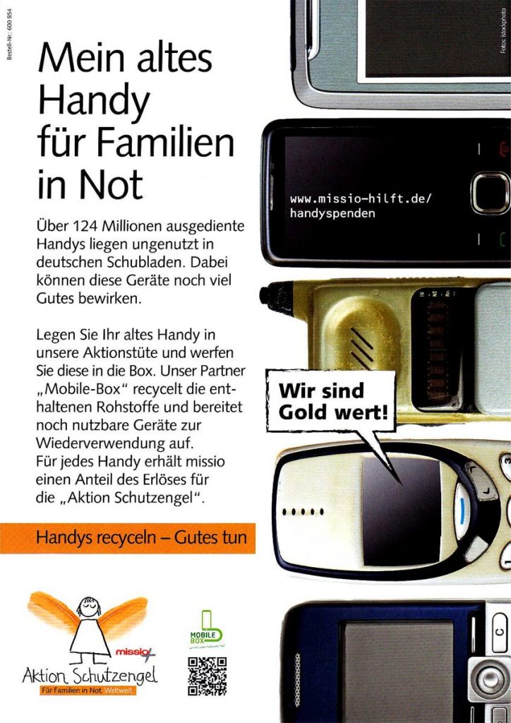 Bringen Sie uns Ihr Alt-Handy für die Sammelbox. Die enthaltenden Rohstoffe werden recycelt und die noch nutzbaren Geräte werden zur Wiederverwendung aufbereitet.